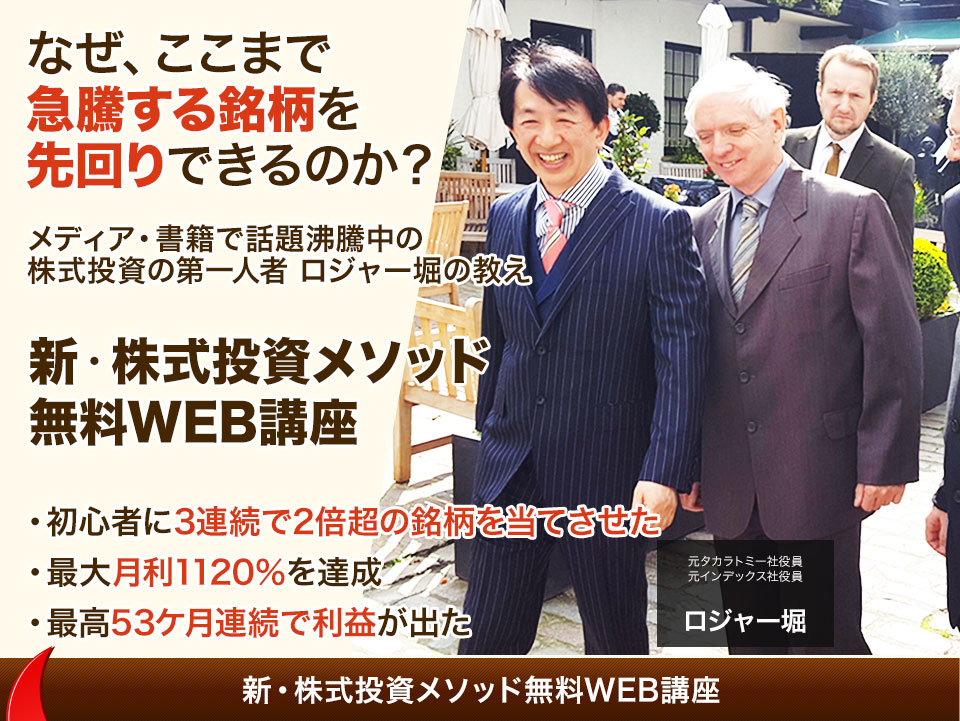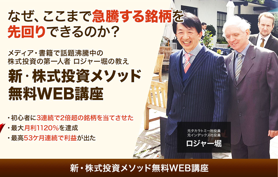 ロジャー堀(堀 篤)です。 野村證券で13年間IPOやM&Aを担当し、その後インデックスやタカラ(現タカラトミー)の取締役を歴任しました。 現在は株式会社日本マネジコ代表として、企業のIRコンサルティングや投資教育を行っています。 著書『3年で資産1億円の築き方』は全国書店ランキング1位を獲得。 投資歴30年以上の経験をもとに。